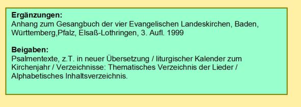1995 wurde es durch das Evangelische Gesangbuch / EG abgelöst. Dieses ist bis heute in Gebrauch. Die badische und zugleich elsass‒lothringische Ausgabe besteht aus einem Lieder‒Stammteil mit 535 Liedern und Kanons und einem Lieder‒Regionalteil mit 150 Liedern und Kanons, alten wie neuen; die Lieder beider Teile sind zunächst nach dem Kirchenjahr und dann thematisch geordnet. Die Liedtexte des Regionalteils wurden meist zu alten, bekannten Melodien verfasst. Vereinzelt gibt es französische Texte. Außerdem gibt es folgende Beigaben: Liturgisch festste-hende Formulare (Ordinarien) zu Gottesdiensten / Psalmen / Gebete / Bekenntnisse / Liturgischer Kalender mit den wechselnden Stücken zu den einzelnen Sonn‒ und Feiertagen (Proprien): Perikopenordnung zum Kirchenjahr / Liederkunde: Liedgeschichte und alphabetisches Verzeichnis der Dichter und Komponisten (Kurzbiographien).