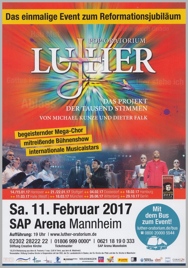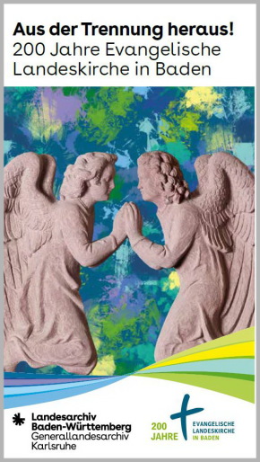 Die Abbildung zeigt auf einem Hintergrund in den Signalfarben der Landeskirche das Relief in der Vorhalle der Christuskirche Karlsruhe, das zur Hundertjahrfeier der Union 1921 von Hermann Föry geschaffen und 1925 aufgestellt wurde. Leider wurde auch dieses für Flyer, Plakat du Exponat-Reproduktion erheblich beschnitten. Besonders die Texte fielen fort: